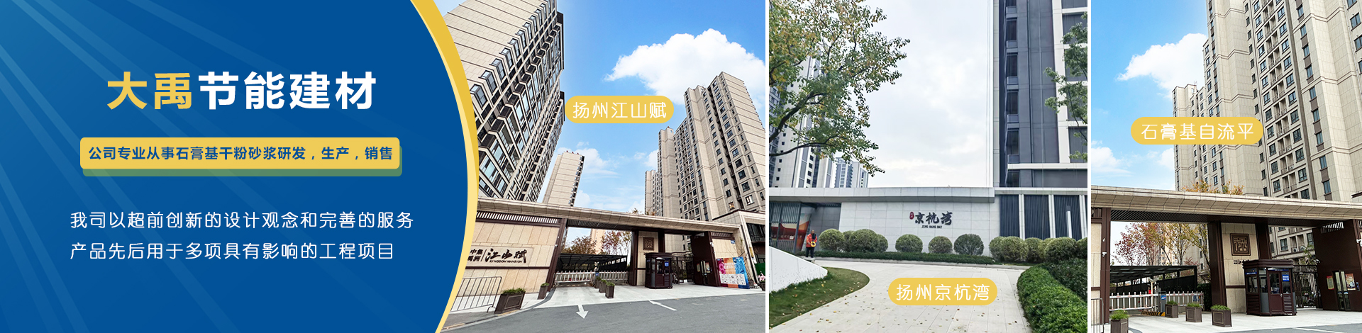 揚(yáng)州市大禹節(jié)能建材科技有限公司成立于2005年9月,位于聯(lián)合國(guó)宜居城市---江蘇省揚(yáng)州市,地處江都經(jīng)濟(jì)開(kāi)發(fā)區(qū),與揚(yáng)、鎮(zhèn)、泰三市接壤,交通十分便捷。公司是專(zhuān)業(yè)從事石膏基干粉砂漿研發(fā),生產(chǎn),銷(xiāo)售一體化的綜合性科技型企業(yè),為國(guó)家標(biāo)準(zhǔn)GB/T2862-2012《抹灰石膏》的參編單位。  公司擁有國(guó)內(nèi)一流的特種砂漿生產(chǎn)線,并配有各種先進(jìn)的檢測(cè)儀器,年生產(chǎn)能力可達(dá)10萬(wàn)噸。各崗位管理及技術(shù)人員齊備,對(duì)產(chǎn)品···